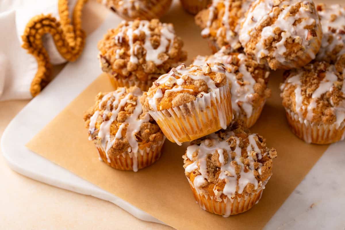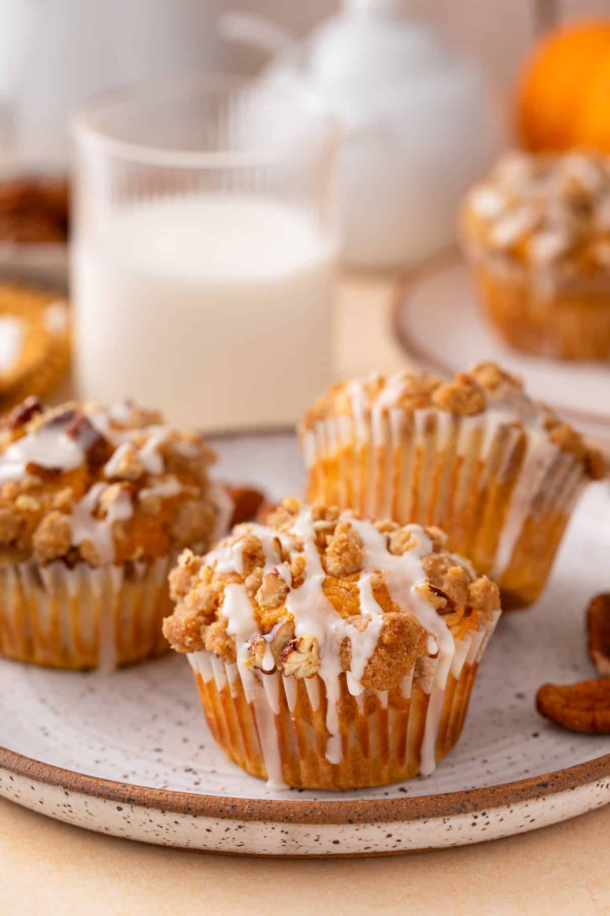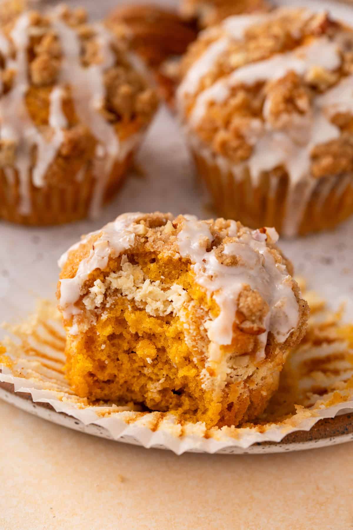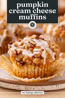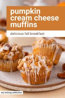 I took a moist classic pumpkin muffin base and added a lightly sweetened cream cheese filling and a brown sugar and pecan streusel on top. After baking, you can choose to add an optional vanilla glaze to make them extra indulgent, but they’re just as delicious without it.