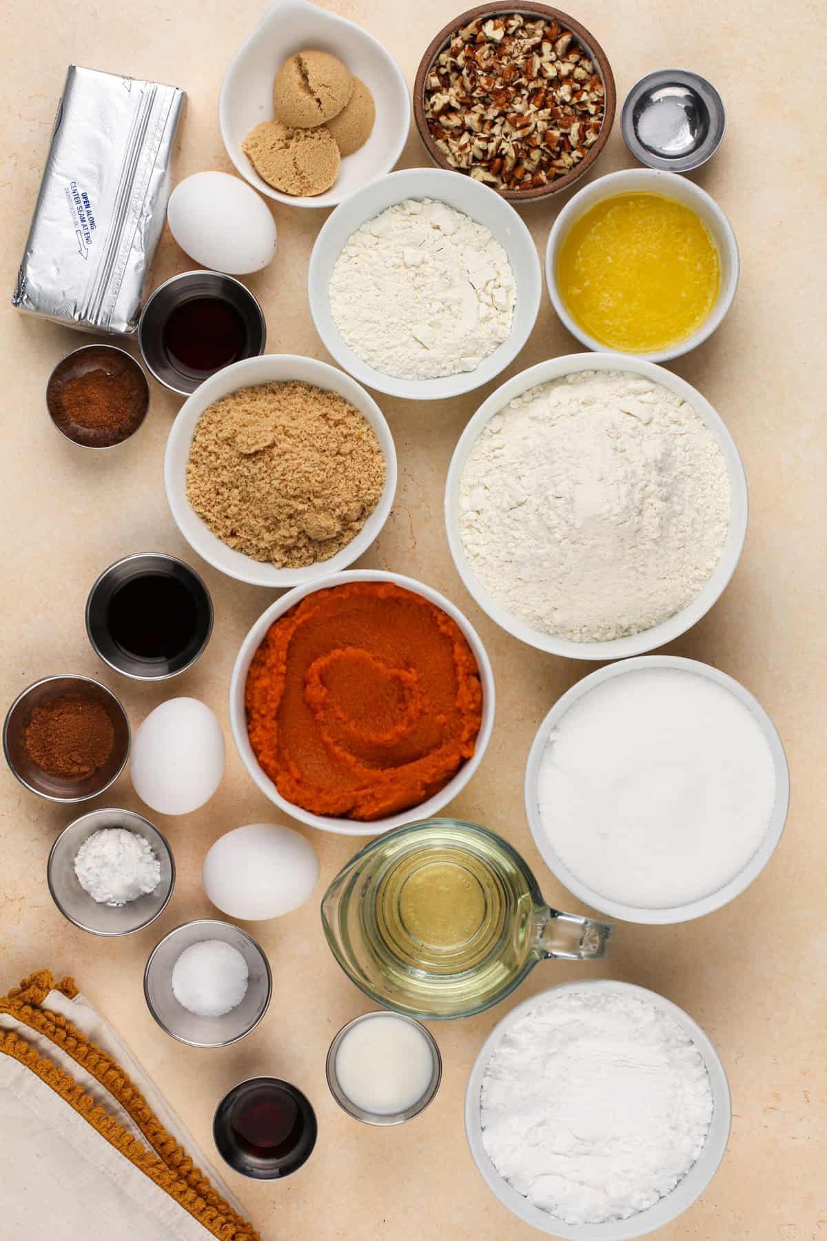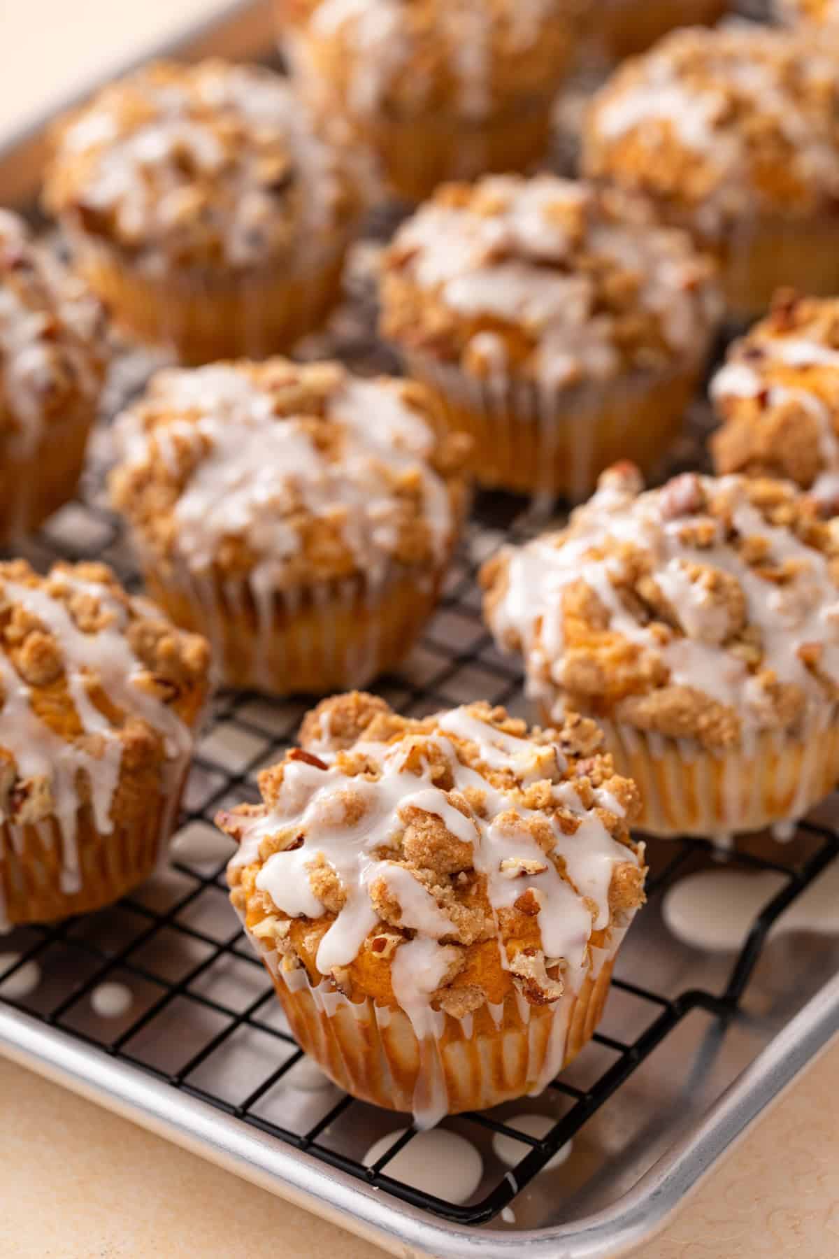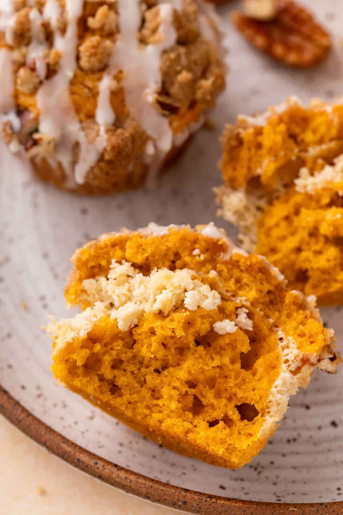 I took a moist classic pumpkin muffin base and added a lightly sweetened cream cheese filling and a brown sugar and pecan streusel on top. After baking, you can choose to add an optional vanilla glaze to make them extra indulgent, but they’re just as delicious without it.