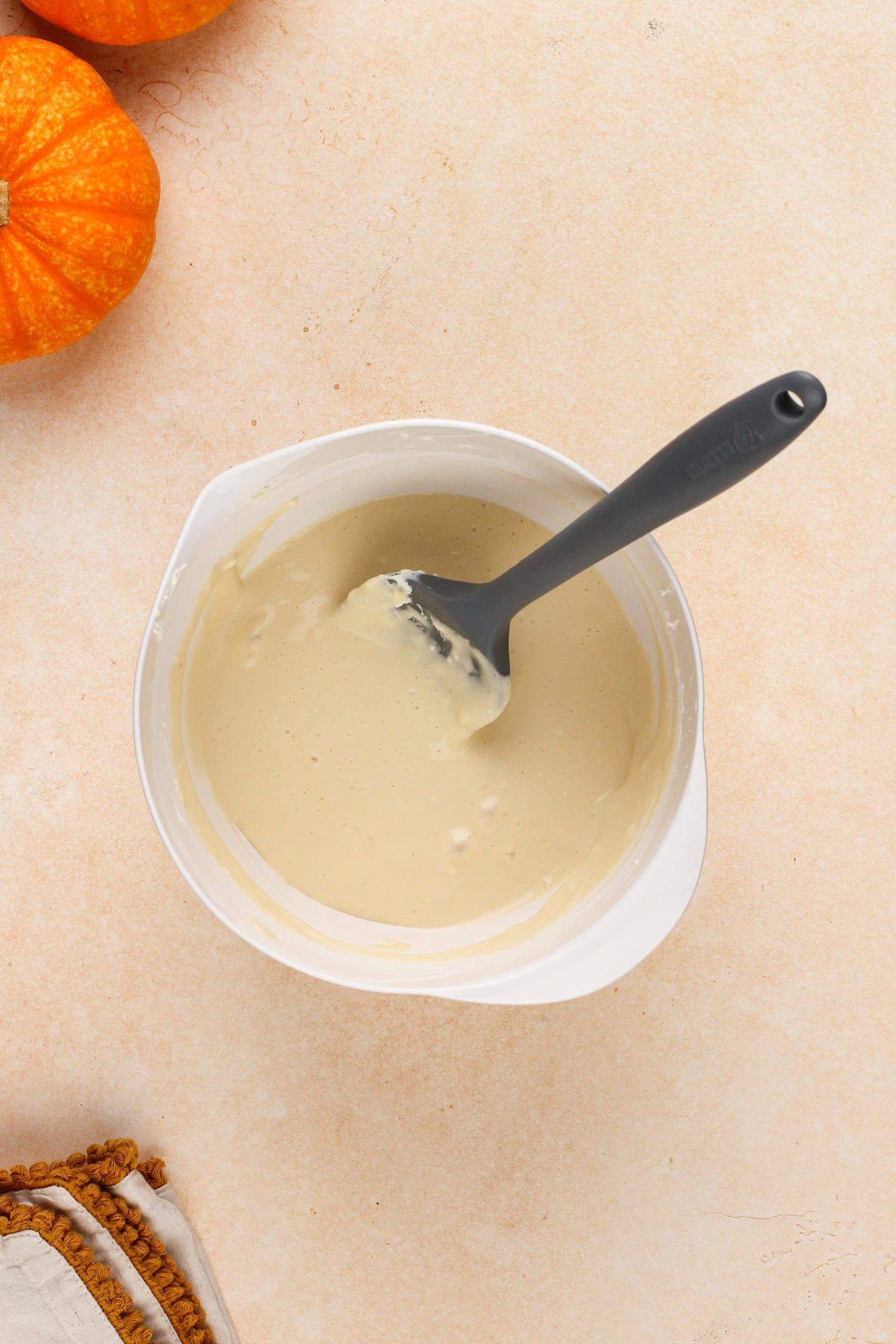 For the topping, mix the brown sugar, flour, pumpkin pie spice, and salt in a bowl. Use a fork to mix in the melted butter until the mixture is crumbly.