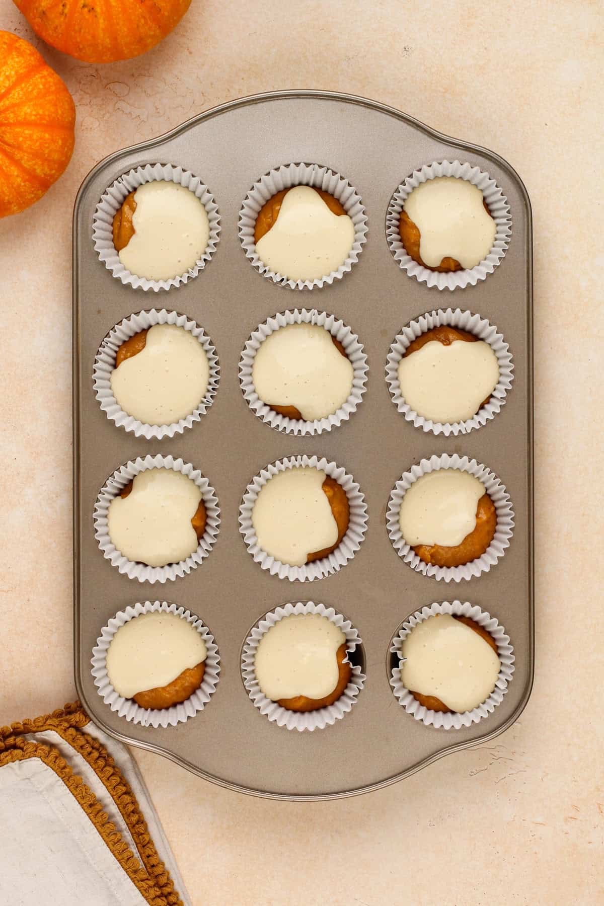 Add about 2 teaspoons of the cream cheese filling to the center of the batter in each well. A small cookie scoop is useful for this part.