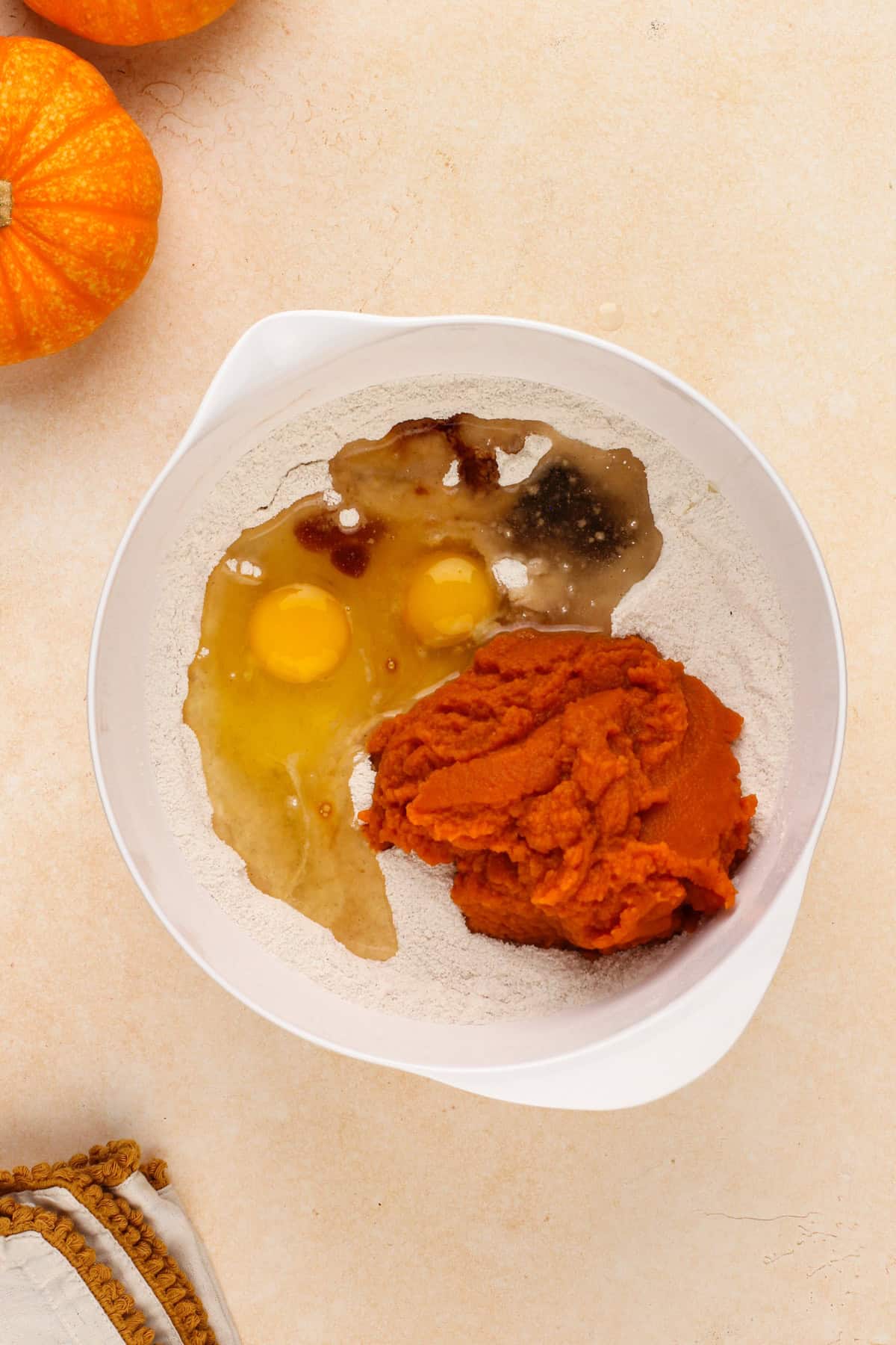- Prepare the Muffin Batter: In a large bowl, whisk together flour, sugar, baking powder, pumpkin pie spice and salt. Add eggs, pumpkin, oil and vanilla. Beat with an electric mixer until just combined and smooth – do not overbeat.