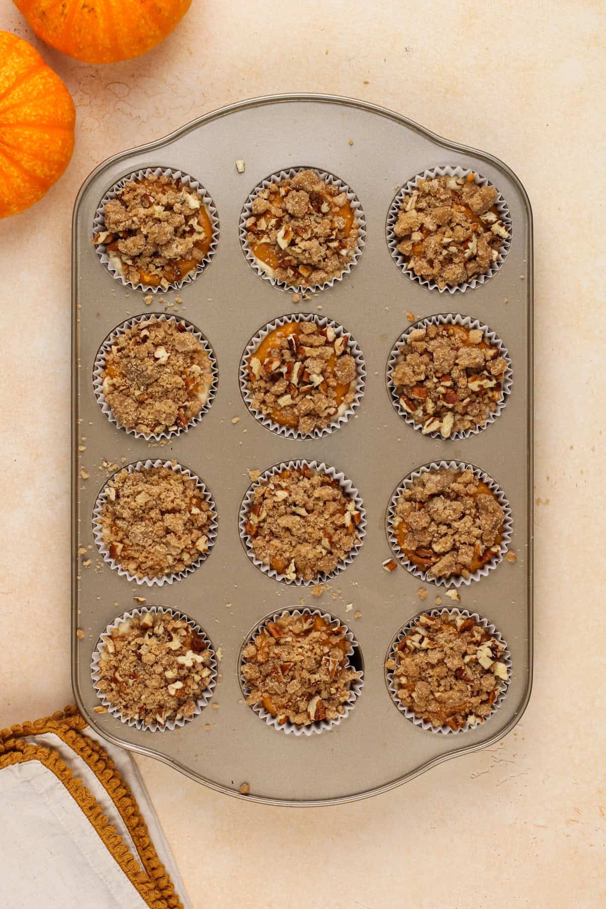Top each muffin with another 1 1/2 tablespoons of batter, then sprinkle the streusel topping evenly over all of the muffins.