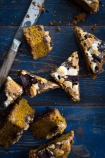 I decided to merge my favorite summer treat (s’mores) with one of my favorite fall flavors (pumpkin) to make some sweet and slightly spiced Pumpkin S’mores Bars. These are thick, cake-like pumpkin blondies topped with all of the toasted, melty s’mores toppings you could ask for. I’m not quite sure why I had never thought to put these two desserts together before, but based on how fast they disappeared from my kitchen, I think they would be welcome again anytime.