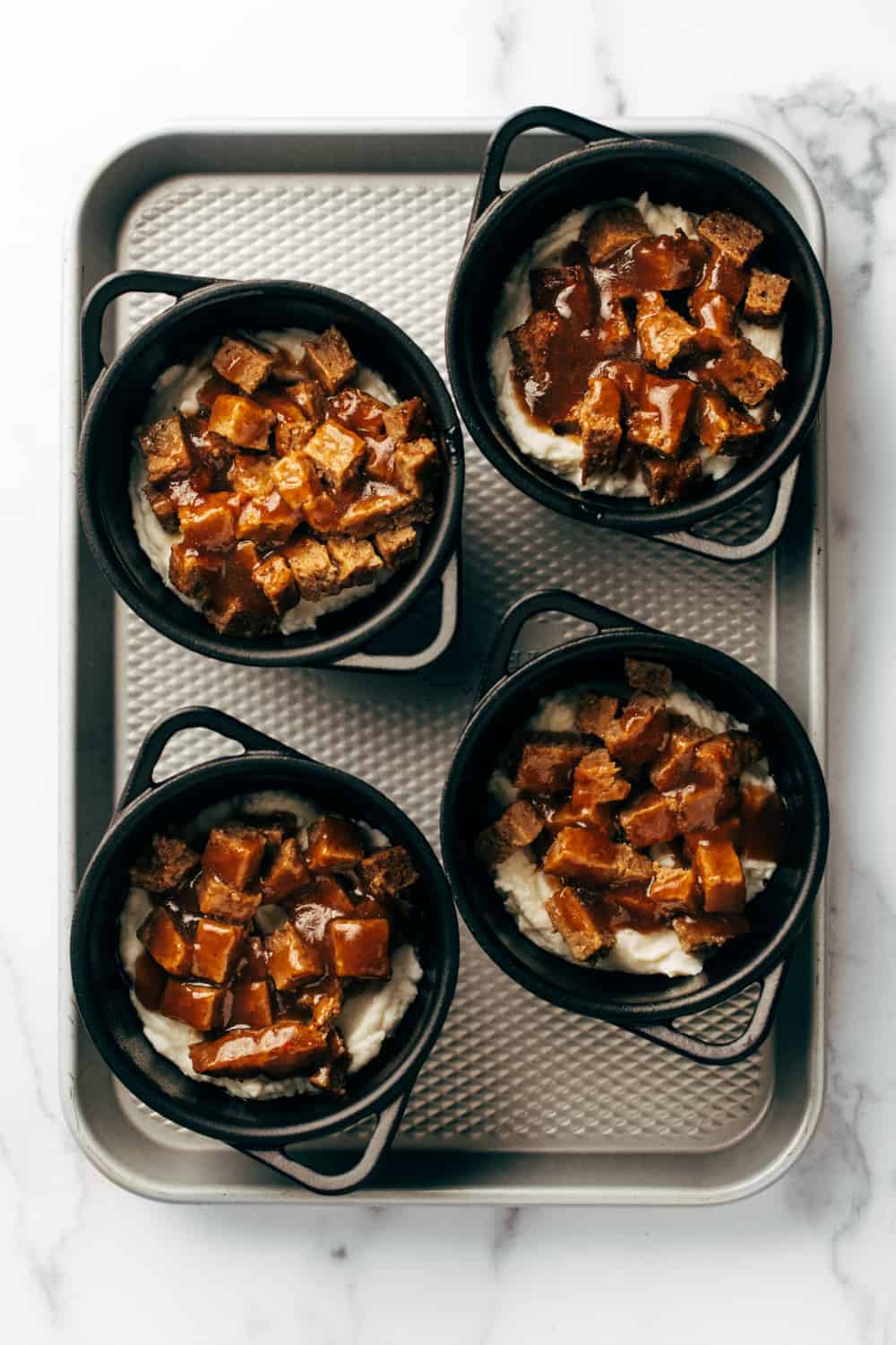 Once the Gravy & 6 Salisbury Steaks are cooked, remove the salisbury steaks from the gravy and dice them up into bite-size pieces. Then layer mashed potatoes, the chopped salisbury steaks and a spoonful of gravy, some peas and carrots and another layer of potatoes in individual ramekins.