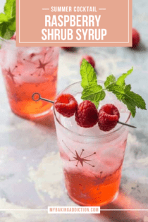 - Fill a glass with ice. Add 3 tablespoons (or to taste) of raspberry shrub syrup to the glass.