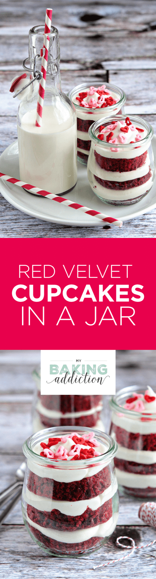 Whether you’re baking for 8-year olds or your sweetheart, I’m fairly certain that just about anyone will fall head over heels for Red Velvet Cupcakes in a Jar.