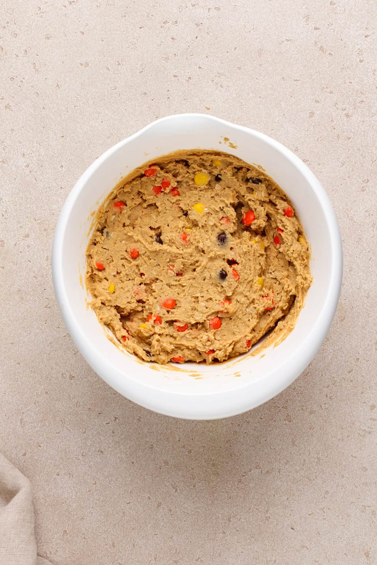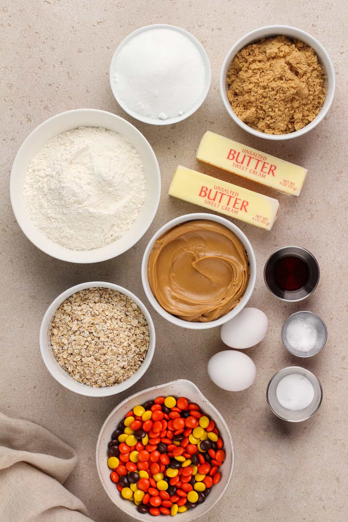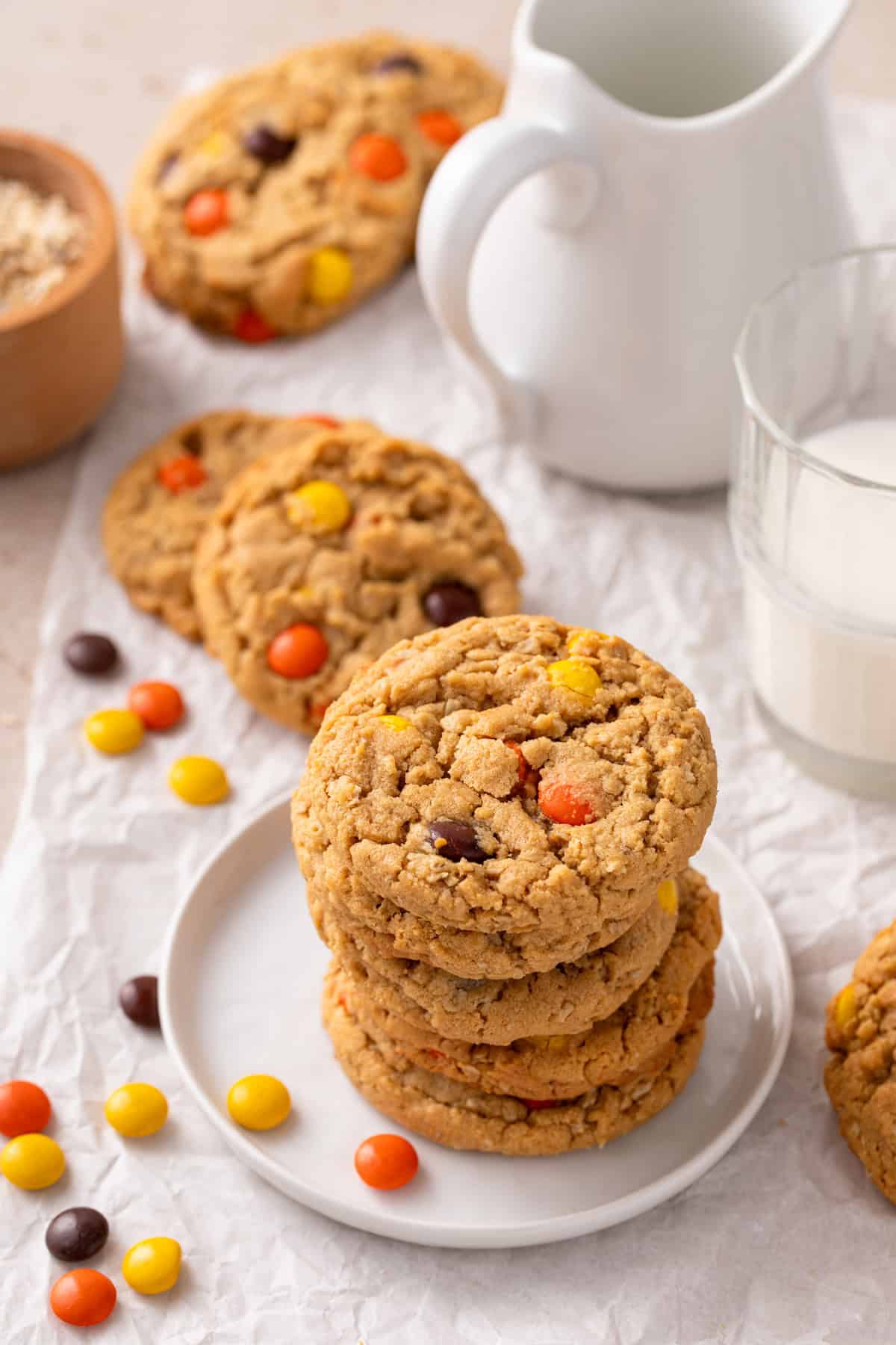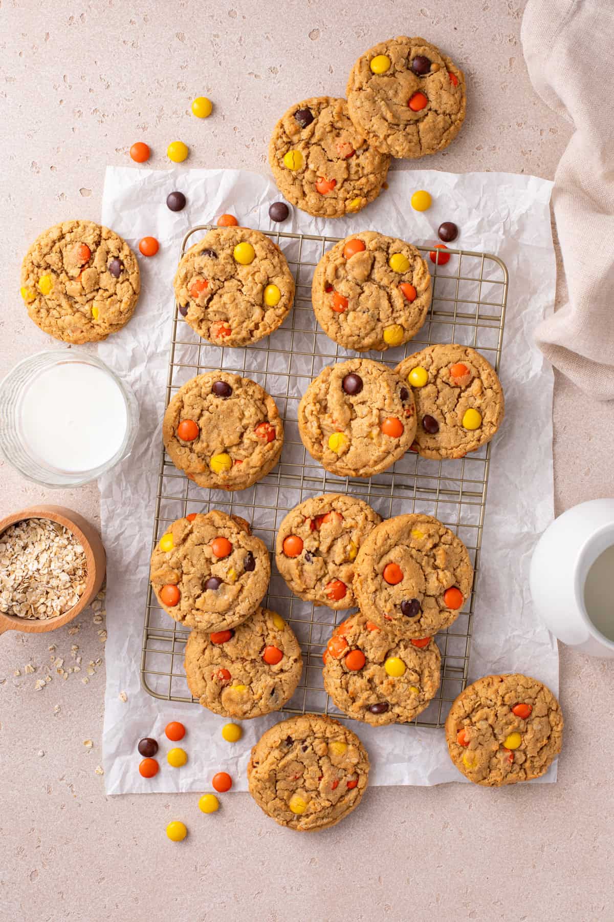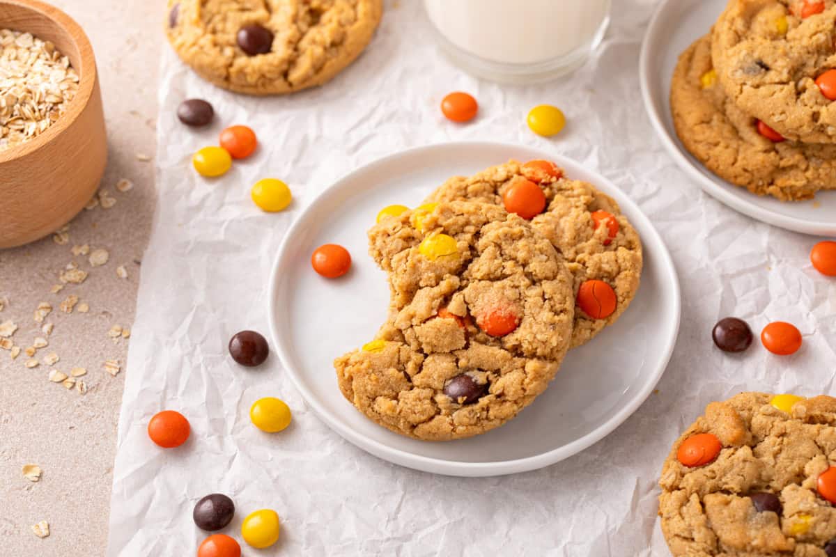 These cookies are really similar to my peanut butter oatmeal cookies, but we’re swapping out the peanut butter chips for Reese’s Pieces. The great news is both recipes are equally easy and delicious!