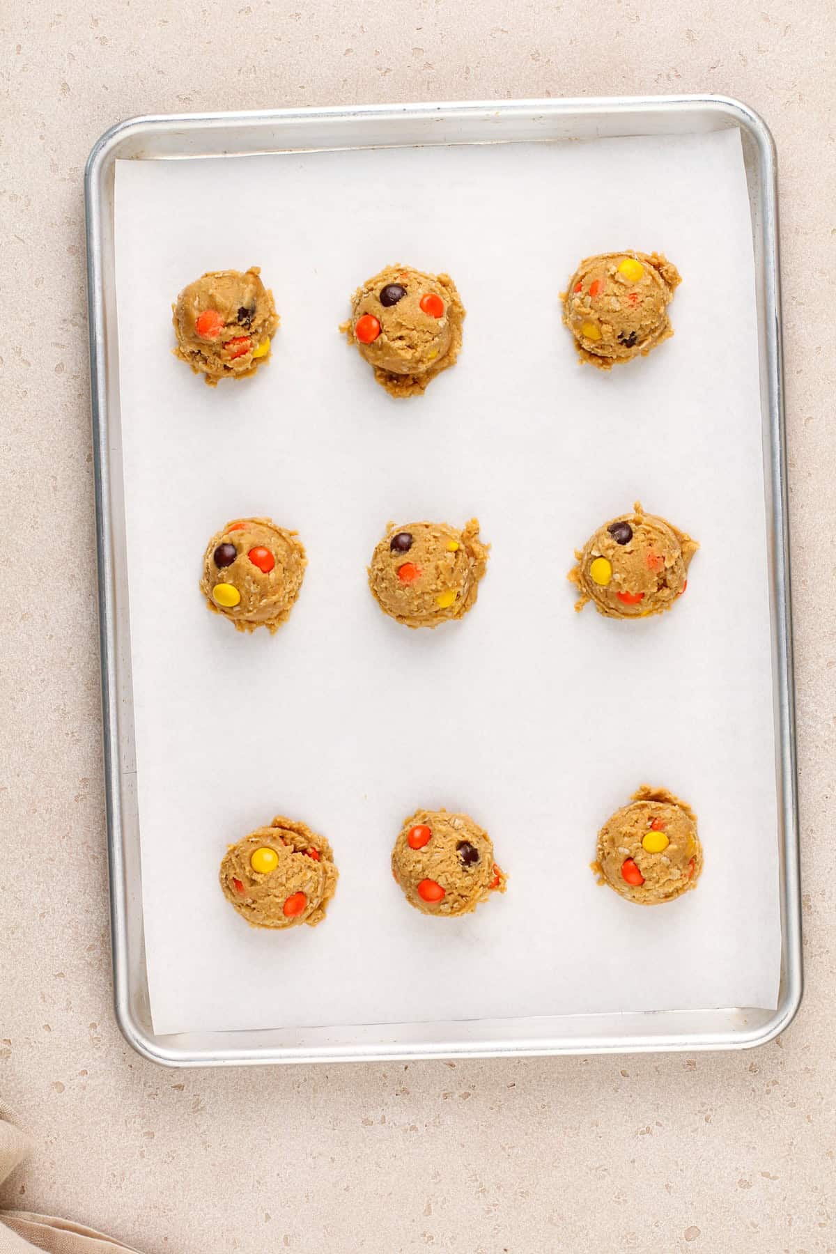 When you’re ready to bake your Reese’s Pieces cookies, use a large cookie scoop to portion the dough onto lined baking sheets. Bake at 350°F for 16-18 minutes; the edges of the cookies should be golden brown.