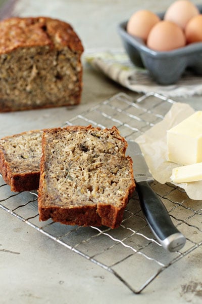 While I was in St. Lucia, the lovely Cindy of Once Upon A Loaf guest posted here on MBA with a fun, tipsy recipe for Bourbon Banana Bread. From the moment I read the post, I knew a boozy banana bread would soon be in my baking future.