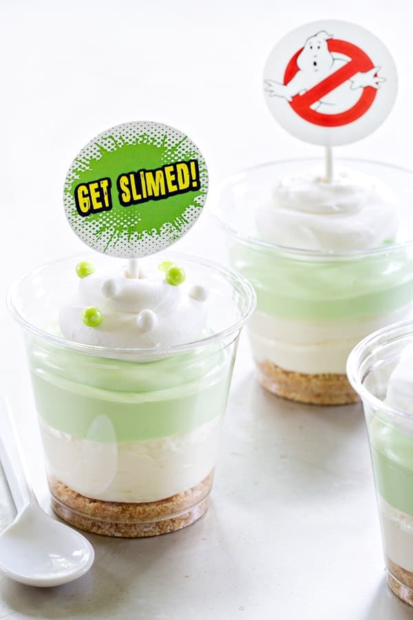 These Slimer Cheesecake Parfaits come together with ease, store beautifully in the fridge, and are all kinds of delicious. The Ghostbusters™ themed tags make them a little more special. You can download them for free directly from Campfire® Marshmallows, by clicking here. Just print them off on white card stock, cut them out, and top all of your Ghostbusters™ dessert creations!
