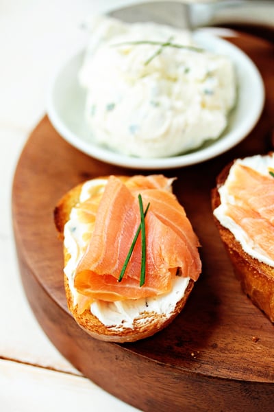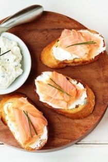Cream cheese and goat cheese are combined with garlic and fresh chives to create a deliciously creamy and flavorful spread to top toasted slices of baguette. Finish it off with smoked salmon and youโve got yourself a sophisticated and delicious appetizer thatโs perfect for a weeknight at home or casual weekend entertaining.