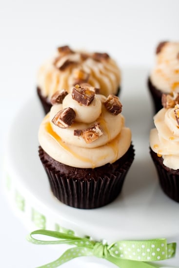 These cupcakes consist of a moist doctored up cake mix recipe with a little surprise in the center, topped with creamy caramel buttercream and a finished with a little sprinkling of chopped Snickers and a caramel drizzle. Are you drooling yet? This recipe is rich, sweet, decadent and every candy bar lover’s dream!