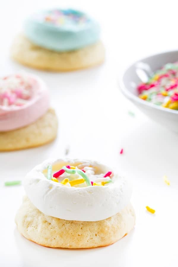 Specifically soft, cakey, sugar cookies that are loaded with buttercream and sprinkles. And if I’m being honest, the ones from the grocery store are my favorite. You know the ones I’m talking about, the brand is Lofthouse, and I avoid them like it’s my j-o-b. And let me tell ya, it’s not because they’re store-bought and I think I can make them better at home. Nope, been there, tried that – they’re never the same. I avoid them because I love them and I’ve been known to polish off an entire plastic container of them in just a couple of days.