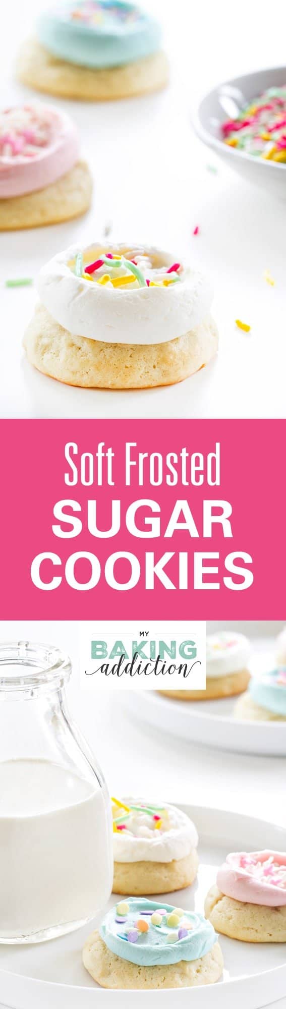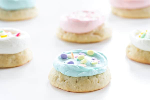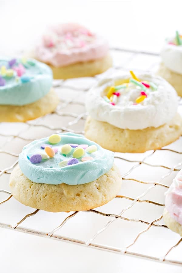 Soft Frosted Sugar Cookies are soft, cakey, and delicious. A swirl of fluffy, pastel buttercream and sprinkles makes them perfect for spring.