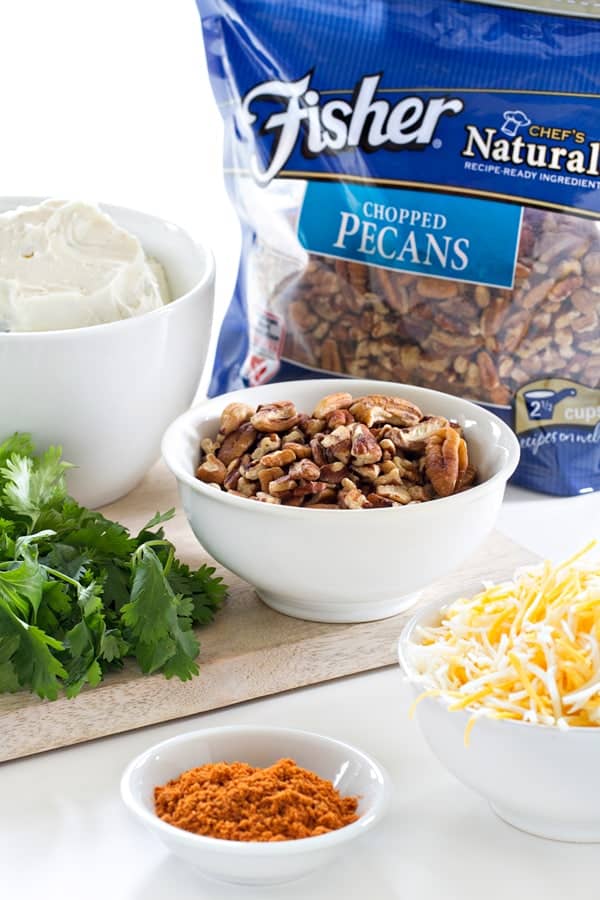 - Shape the mixture into a ball. Stir together the remaining cilantro and the chopped pecan. Roll the cheese ball into the mixture to coat completely, gently pressing the pecans to adhere.