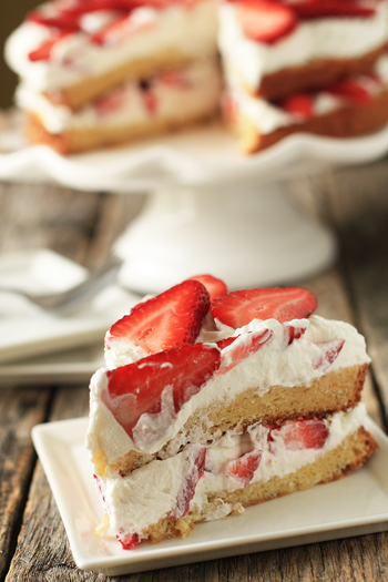 - To make the filling for one cake, whip the cream, sugar, and vanilla in a mixer fitted with the whisk attachment until firm. Slice one of the cakes in half with a long, sharp knife. Place the bottom slice of the cake on a serving platter, spread with 1/2 the whipped cream and scatter with sliced strawberries. Cover with the top slice of the cake and spread with the remaining cream. Decorate with strawberries.