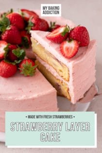 Strawberry layer cake is made with two layers of moist cake bursting with pieces of fresh strawberries and a sweet strawberry frosting. This delicious, fruity cake is perfect for summer!