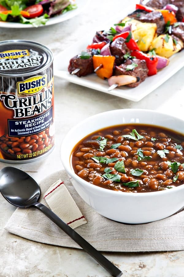 We paired these Sweet and Spicy Kebabs with BUSH’S® Steakhouse Recipe Grillin’ Beans®. They’re slow-cooked with onion and bell pepper in a delicious steak sauce with just a hint of smokiness that is sure to please even the pickiest of husbands.