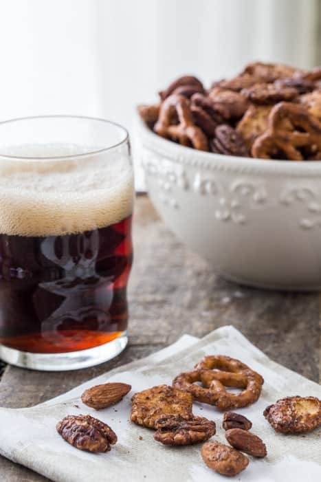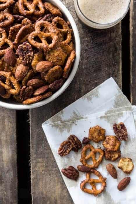 Chock full of Fisher almonds and pecans, pretzels and oyster crackers, and a savory sweet spice mix, you will NOT be able to stop eating it! It comes together so quickly we’ve made several batches in the last week, even with a newborn in the house. Now that is seriously easy.