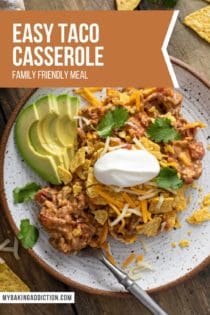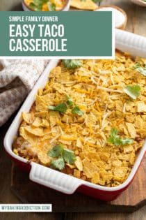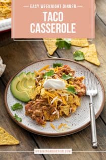 This taco casserole is my family’s latest favorite. It’s a 30-minute meal that I can quickly make on a weeknight and we can all add our favorite toppings to it.