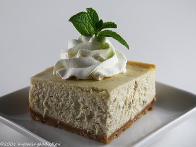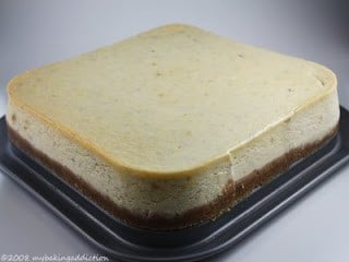 I really loved the way this turned out. The banana flavor was subtle yet delicious and the vanilla wafers complimented the cheesecake perfectly. I will definitely make this recipe again and again. PLUS I got to use my nifty square springform pan for the first time. I have never seen these in stores, but target seems to carry a few shapes online. Click here for the one I bought. Also…here is a tip for those of you that had problems with water seeping into your springform pan from the bain–marie…I wrap my pan in foil then place the pan into an oven bag before placing into the bain-marie. Oven bags are an inexpensive way to ensure no water seeps your springform pans!