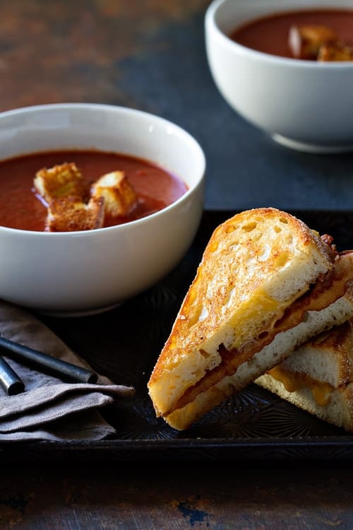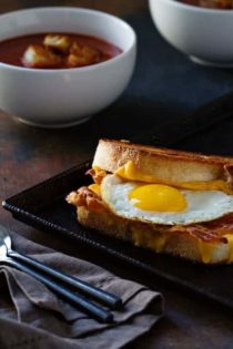 Rustic, thick-cut Italian bread piled high with crispy bacon, velvety fried eggs and American cheese. The whole thing is slathered in melted butter and grilled to melty perfection. When sliced into, the yolks burst, and every bite is absolute perfection. Especially when dipped in flavorful soup. The bright tomato and basil cut right through the richness of this grilled cheese, making every dipped bite better than the last.