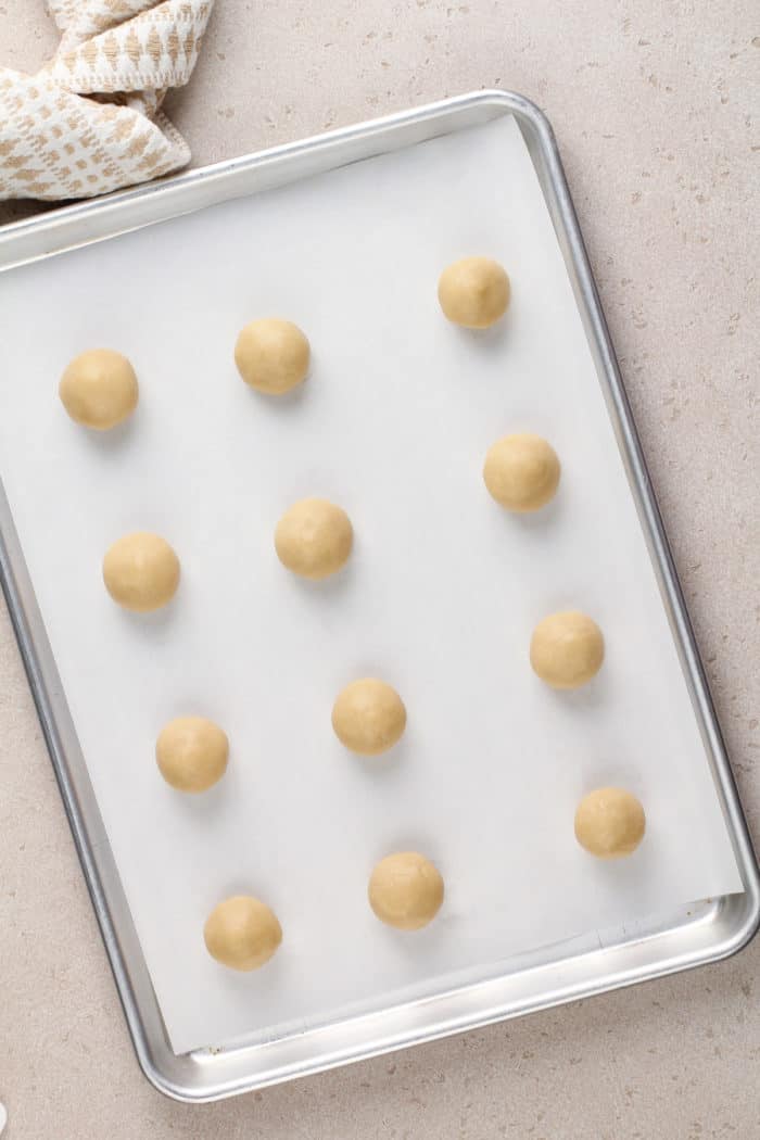 Scoop the dough into 1-tablespoon portions. Roll between your palms to make a smooth ball, then place each ball onto a parchment-lined baking sheet.