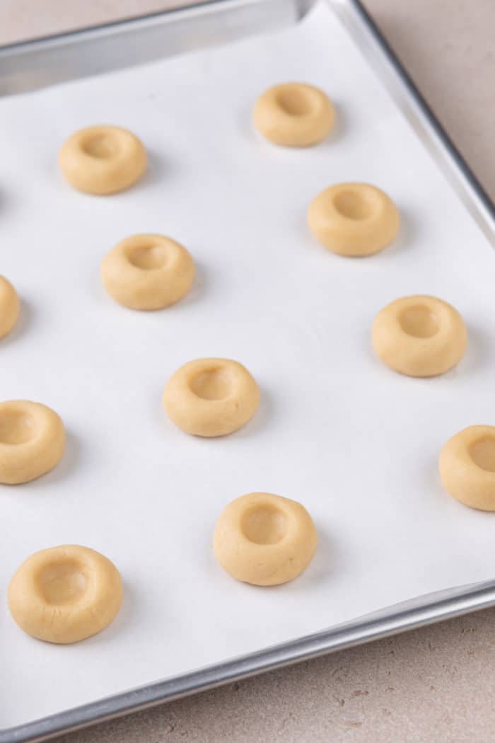 If you want to make thumbprint cookies ahead of time and freeze them, I recommend freezing them before they are baked.