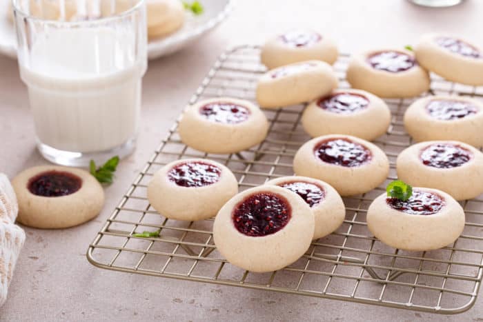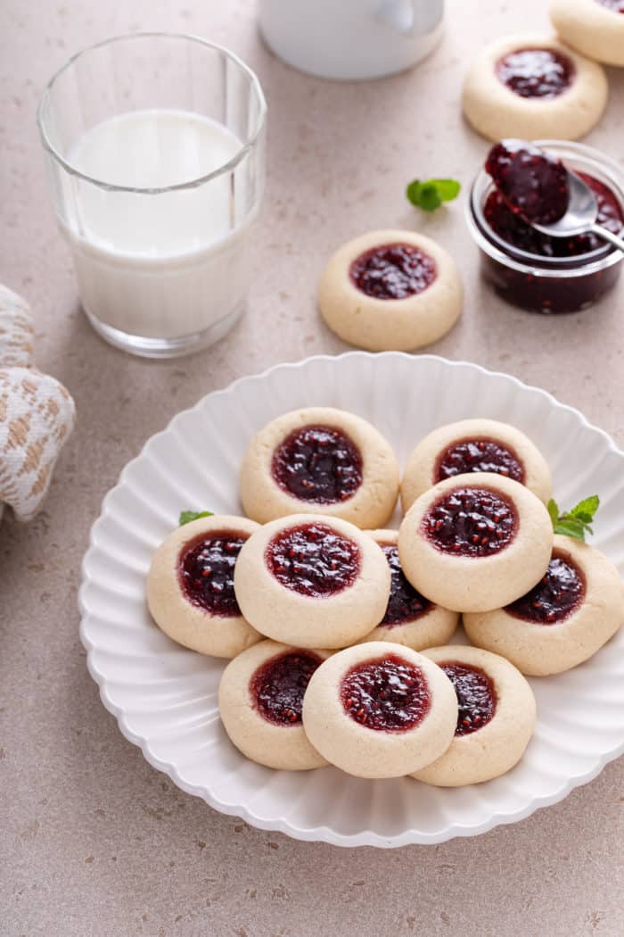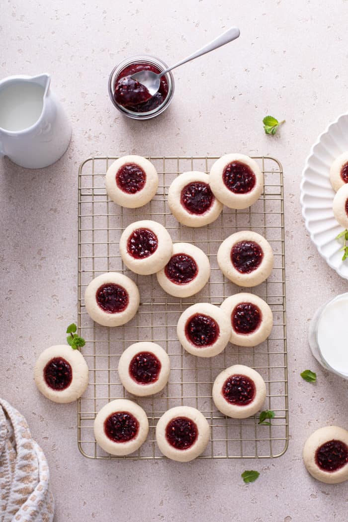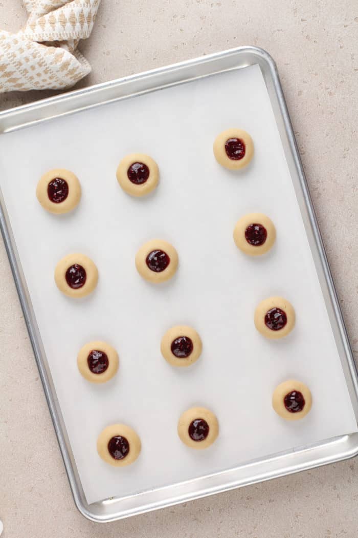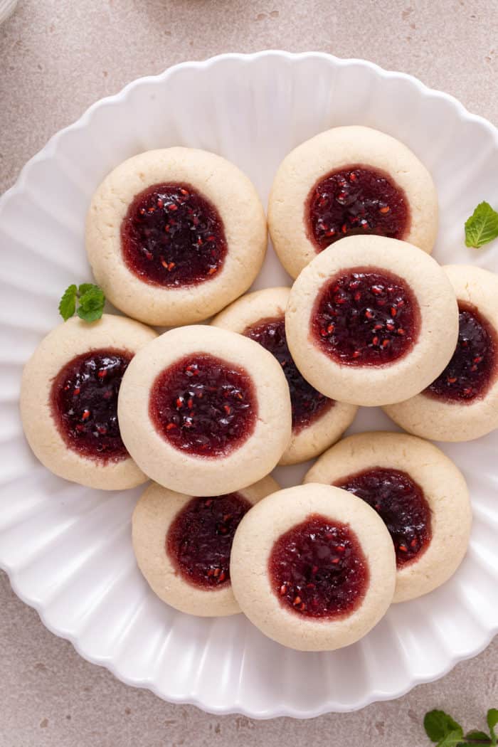The most common type of jam used in thumbprint cookies is raspberry jam or raspberry preserves. Similar to raspberry linzer cookies, there’s just something about that combination of tart-sweet raspberries and buttery cookies.