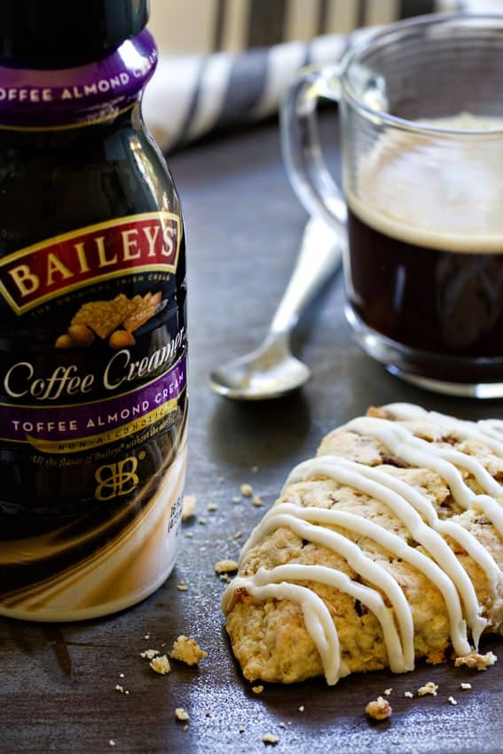 These Toffee Almond Scones are made with BAILEYS® Coffee Creamer Toffee Almond Cream and delectable crunchy toffee chocolate bits. Just a little bit of decadence to start your day off with a bang. It’s what I do.
