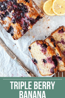 Triple Berry Banana Bread is a fun, fruity twist on the beloved classic. With blackberries, blueberries, raspberries, and a simple lemon glaze, this banana bread is one for the books!
