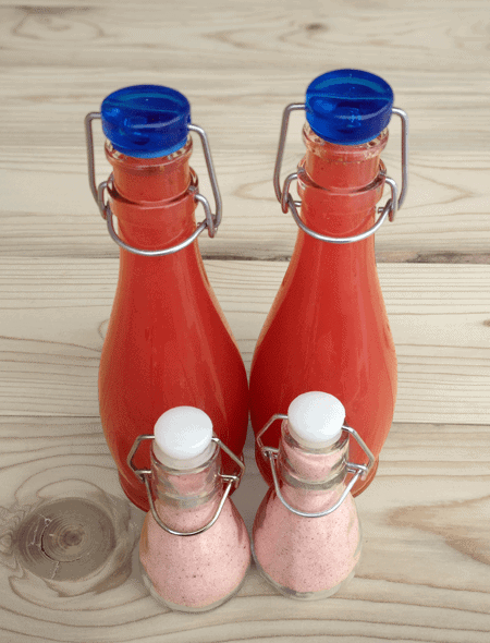 - Pour into glass bottles and keep refrigerated (do not freeze, there is enough water in the berry mixture that the vodka will freeze and could expand out of the bottle)