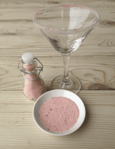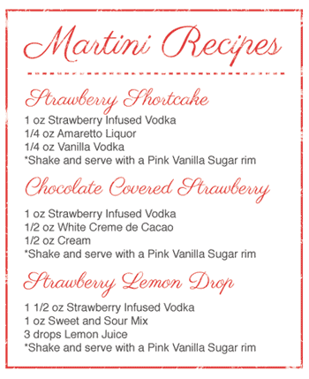 I found two easy recipe ideas to use for this DIY craft. The first is Quick Strawberry Infused Vodka from Tokyo Terrace, and it’s SO EASY! The second recipe is for Pink Vanilla Sugar from Somewhere Splendid and it is also crazy easy! These two recipes go together to make awesome “Martini Gift Sets”. Throw in some recipe ideas and a fancy martini glass for a perfect present!