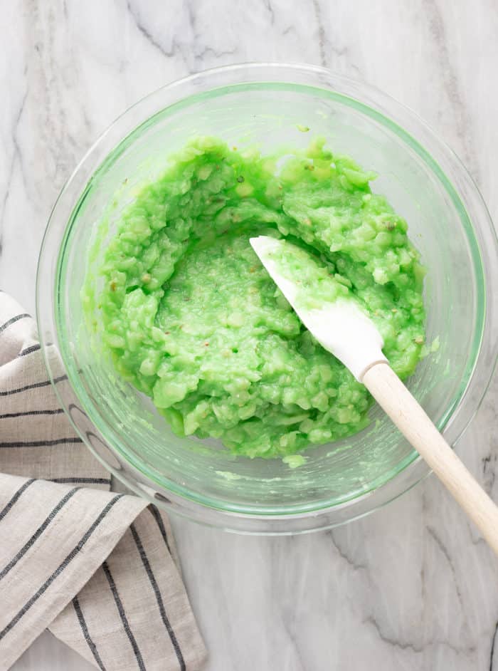 The dessert is a springy green color and the flavor is sweet, a little nutty, and a bit fruity from the pineapple.