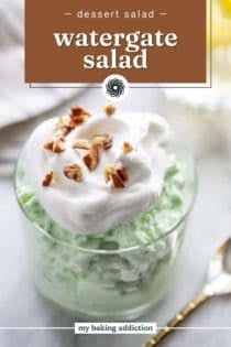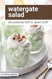 Watergate salad – sometimes called pistachio fluff, pistachio delight, or “green stuff” – is loaded with pistachio pudding, crushed pineapple, miniature marshmallows, and pecans. It’s perfect for a potluck or easy mid-week dessert.